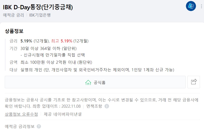 IBK기업은행 - IBK D-Day통장(단기중금채)