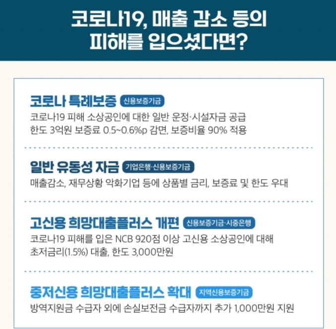 코로나19로 인해 피해를 입은 소상공인에 대한 일반 운정 및 시설자금 공급 한도 3억 원 보증료 0.5 ~ 0.6%p 감면