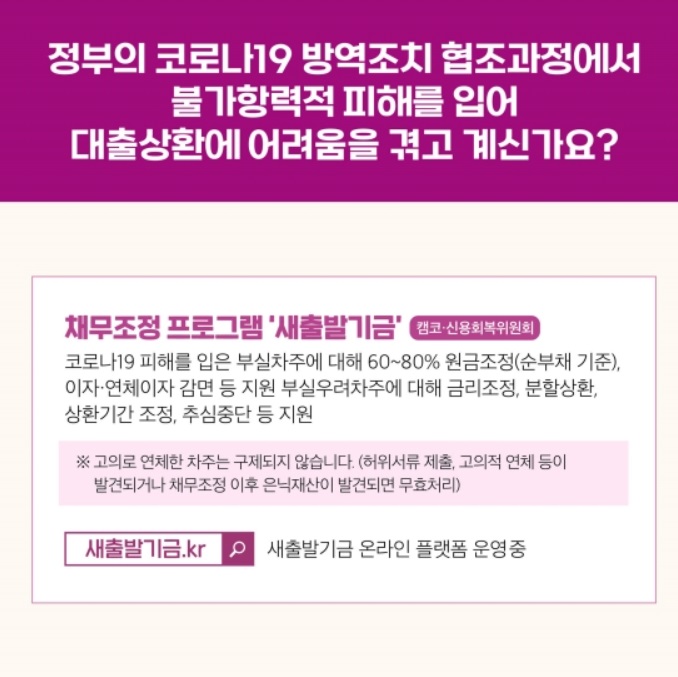 코로나19 피해를 입은 부실 차주에 대해 60~ 80% 원금 조정(순부채 기준), 이자 및 연체이자 감면 등 지원 부실 우려 차주에 대해 금리 조정, 분할상환, 상환기간 조정, 추심 중단 등 지원