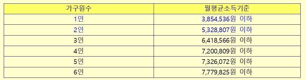 2인 가구 : 5,328,807원 이하 / 맞벌이 6,297,681원 이하
