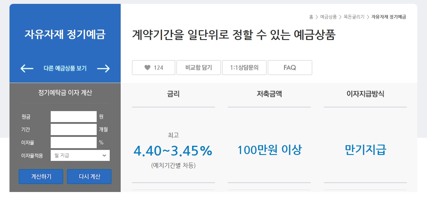 계약기간은 1개월 ~ 5년 이내이며, 가입대상과 가입금액에 제한이 없는 상품입니다.