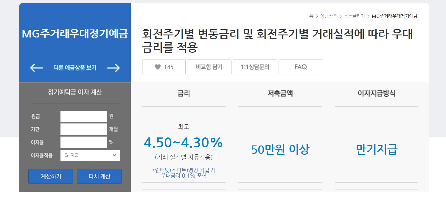 MG주거래우대정기예금 상품은 회전주기별 변동금리 및 회전주기별 거래실적에 따라 우대 금리를 적용해줍니다.
