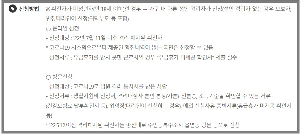 - 신청대상 : 코로나19로 입원, 격리 통지서를 받은사람