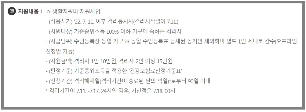 - 지원금액 : 격리자 1인 10만원, 격리자 2인 이상 15만원