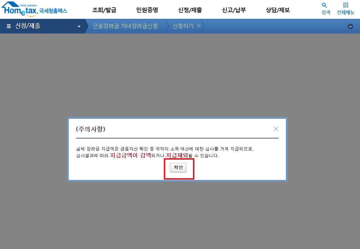 만약 신청 후 근로장려금 대상자가 아니라고해도 불이익은 없으니 근로장려금 정기신청을 눌러 대상자가 아니라는 창이 뜨지 않는다면 계속해서 신청하시면됩니다.