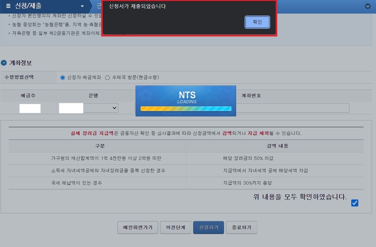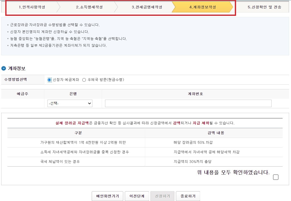 인적사항 등을 작성하고 본인 명의의 계좌 정보를 바르게 입력 후 신청하기를 눌러주세요.