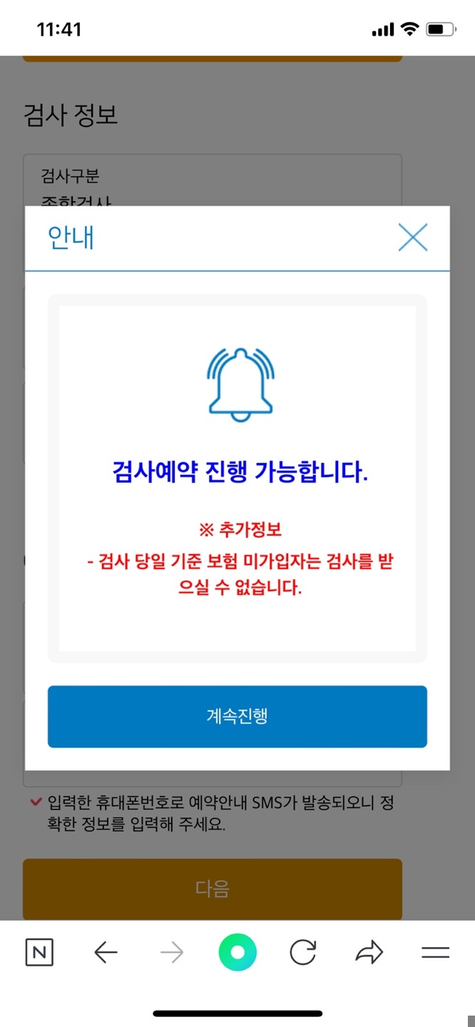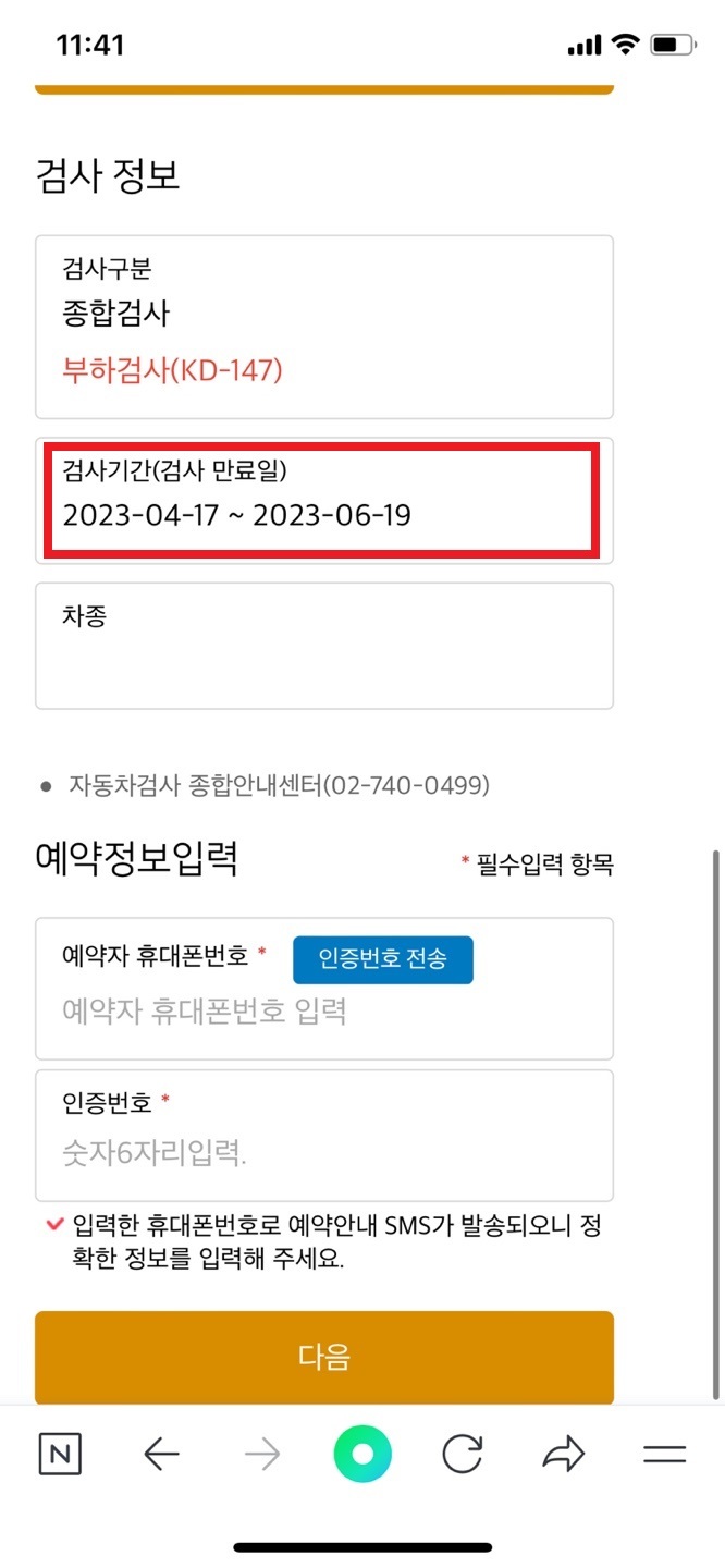 저 같은 경우에는 4월 17일 ~ 6월 19일까지 자동차검사 기간입니다. 자동차검사 유효기간 만료일은 5월 18일이고요, 유효기간 만료일부터 전 후 30일 동안이 자동차 검사기간입니다. 예약자 휴대폰 번호를 입력하고 인증을 진행해주세요. 이때는 차량 소유자가 아니더라도 누구나 자동차검사를 진행할 수 있습니다. 만약 본인이 바쁘다면 가족 중 누군가가 대신 검사를 받아도 무관합니다.