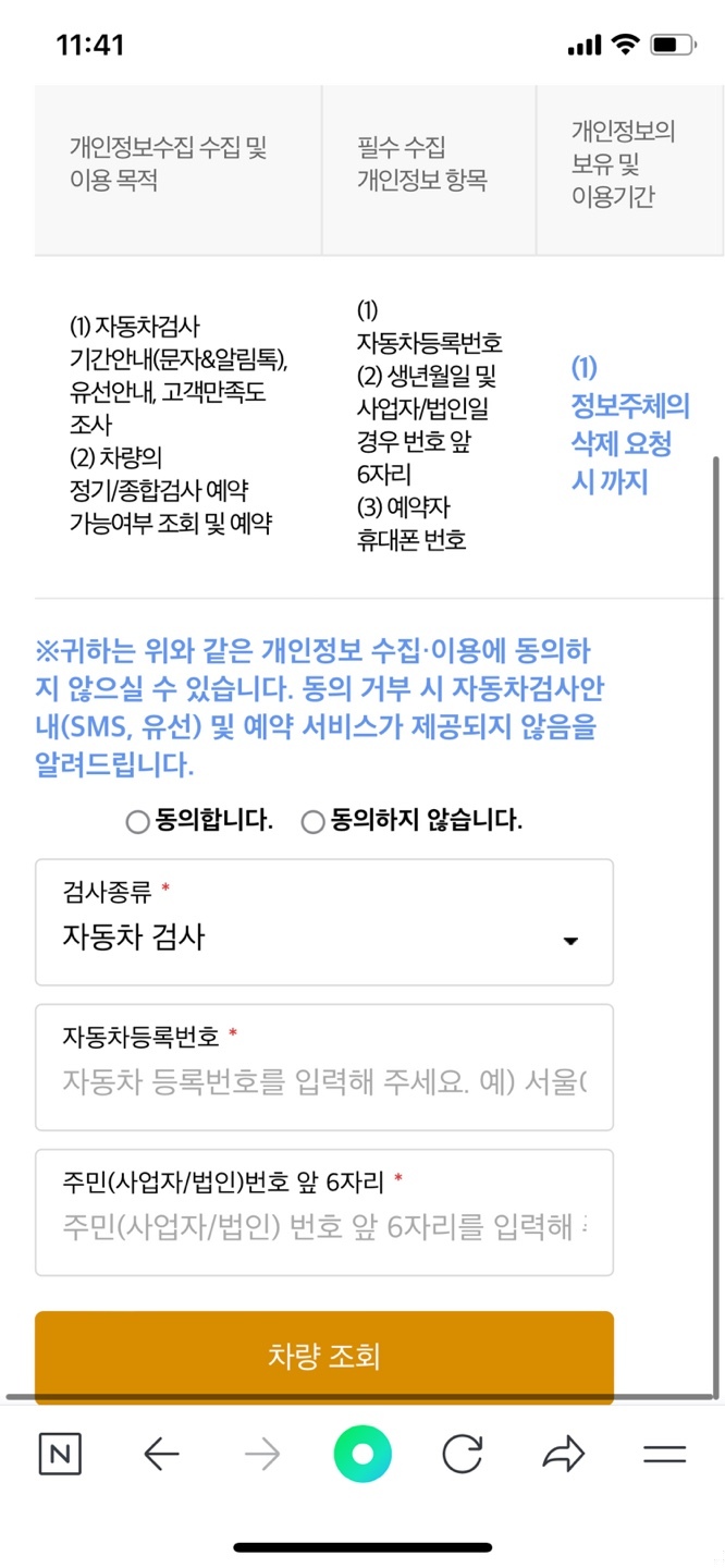그리고 동의합니다에 체크 후 자동차등록번호에 차량 번호를 입력하시고, 주민등록번호 앞자리 7자리를 입력해주세요. 그럼 본인 차량이 검사기간이라면 자동차검사 예약 진행이 가능합니다. 본인 차량이 검사기간이 아니라면 자동차검사 예약 불가하니, 자동차검사 기간이 궁금하다면 1577-0909 또는 이맘때쯤 검사를 받았던것 같은 시기에 다시 한 번 조회해보시길 바랍니다.