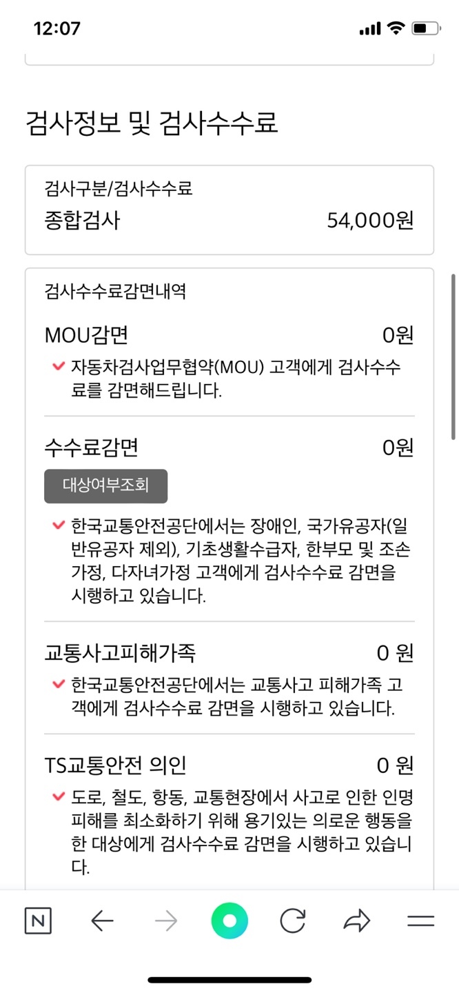 자동차검사 예약 날짜와 검사소, 시간을 정하면 예약 안내가 나옵니다. 꼼꼼히 확인후 다음으로 넘어가주세요. 저는 종합검사로 54,000원이 발생하네요. 은근히 자동차검사 비용이 만만치 않습니다. 자동차검사는 정기검사와 종합검사로 나뉘는데요, 정기검사와 종합검사는 항목은 거의 동일하지만 종합검사의 경우 배출가스를 확인합니다.
