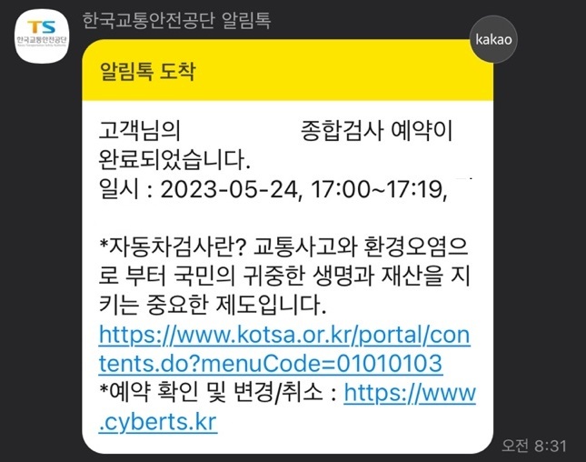 자동차검사 예약 진행을 완료하면 또 한 번 도로교통안전공단에서 안내문자가 옵니다. 자동차검사 예약 확인 및 변경/취소 링크를 통해 변경이나 취소도 가능합니다. 자동차검사 전 날에도 이러한 안내 문자가 오니 만약 검사 진행을 못하겠다면 예약을 변경하시면 됩니다.