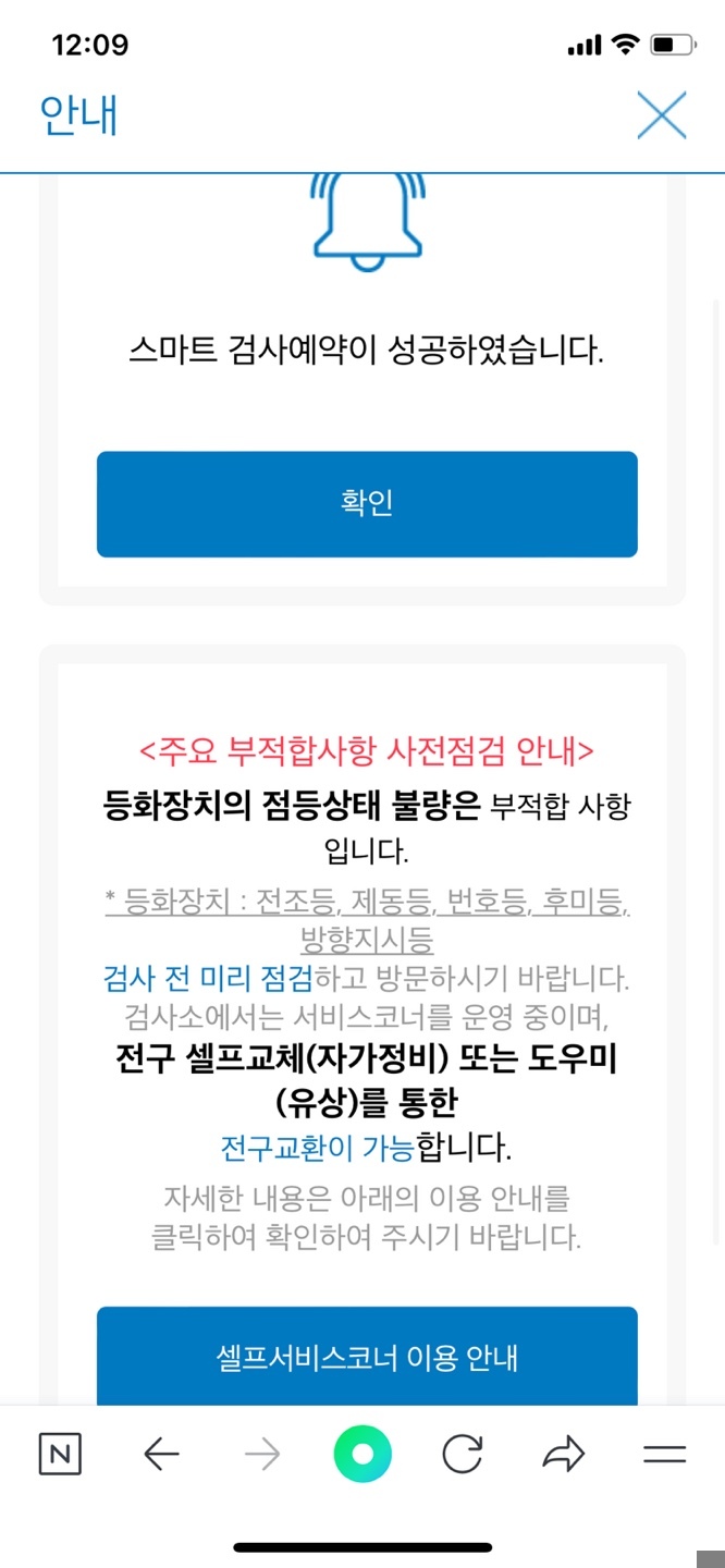 자동차검사 예약 완료되었다는 안내문구와 함께 부적합사항 사전 점검 안내가 나오네요. 제작년에 진행했을 때는 이런 점검안내는 없었던 것 같은데 자동차검사가 좀 더 까다러워졌나 봅니다. 등화장치의 경우 눈으로 확인이 가능하니 한 번 확인해보시길 바랍니다.