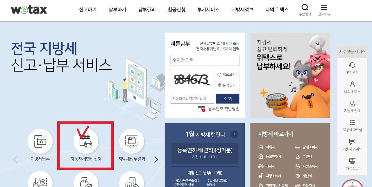 자동차세 연납신청 방법은 1월 16일 위택스에 접속하여 아래의 사진과 같이 접속하여 신청하시면 되겠습니다. PC 뿐만 아니라 핸드폰 위택스 어플로도 자동차세 연납신청 가능하니 참고바랍니다.