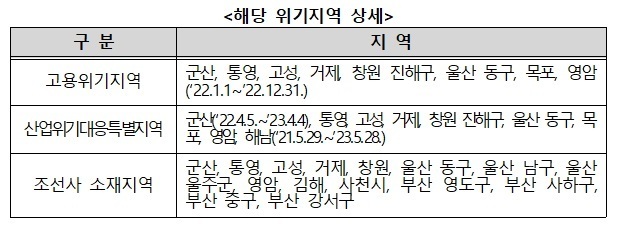 지원대상 : 고용위기지역, 조선사소재지역, 산업위기대응특별지역 소재 소상공인
