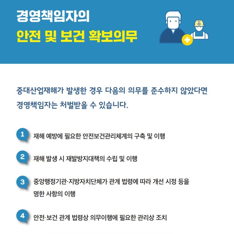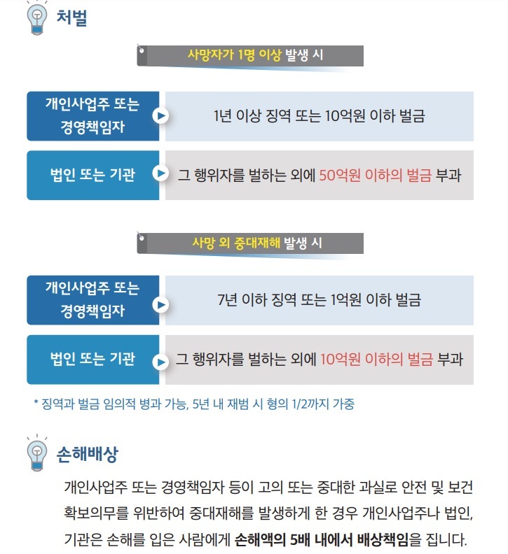 - 개인사업주 또는 경영책임자 : 1년 이상 징역 또는 10억원 이하 벌금