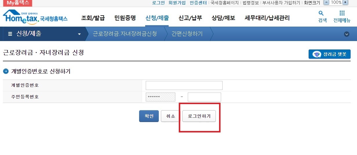 홈택스 접속 후 근로자녀장려금(정기) 간편신청을 눌러주세요. 안내문자로 개별인증번호를 받지 못했으니, 로그인하기를 눌러 본인이 편한 방법으로 인증하여 로그인해주세요.
