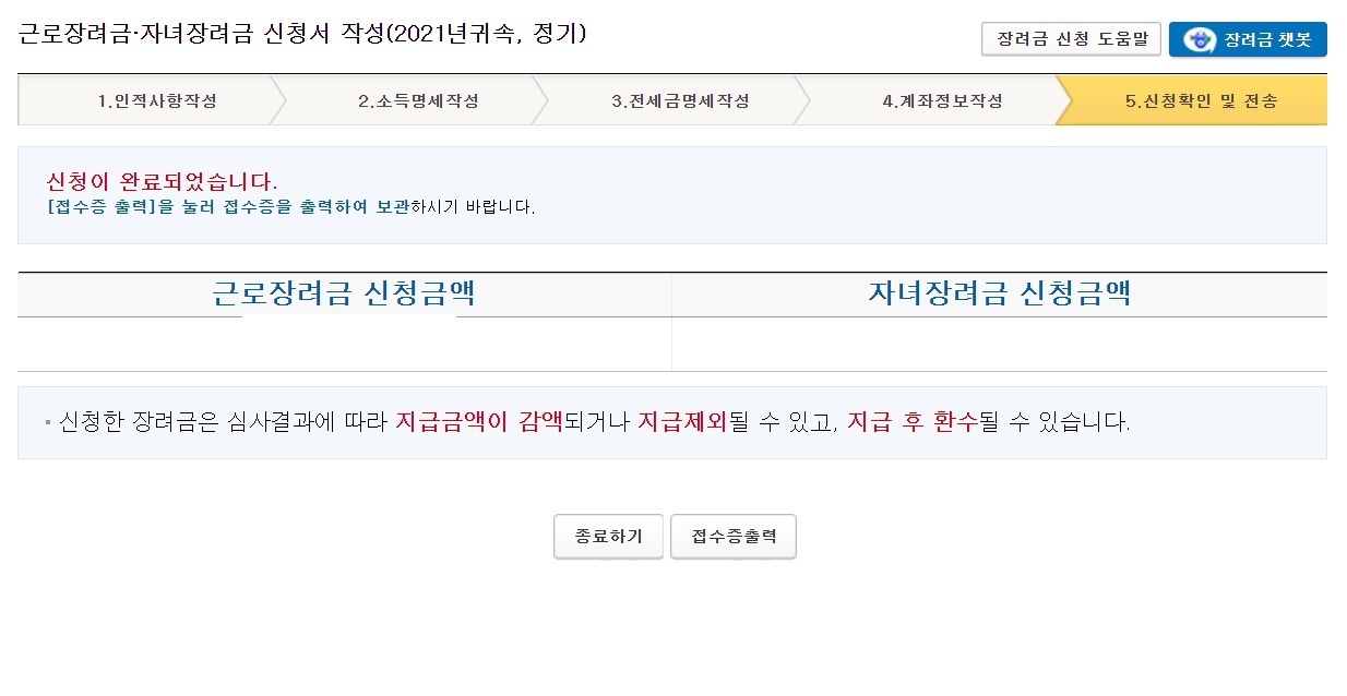 신청서가 완료되었다는 안내문의 확인을 누릅니다.그럼 본인이 받을 예상 근로장려금 신청 금액과 자녀장려금 신청금액이 나옵니다. 완료페이지 아래에서도 나오지만 신청한 장려금은 심사결과에 따라 지급금액이 감액되거나 지급제외 될 수 있으며 지급 후 환수될 수 있습니다.