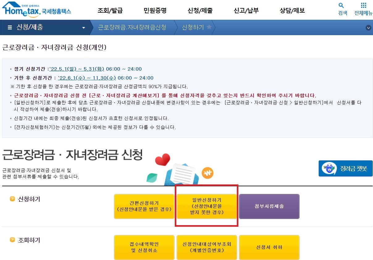 로그인 후 일반신청하기(신청안내를 안 받은 경우)를 눌러주세요. 홈택스를 통한 근로 장려금 지급 대상자 확인 방법은 근로장려금 정기신청을 해보는 것입니다.