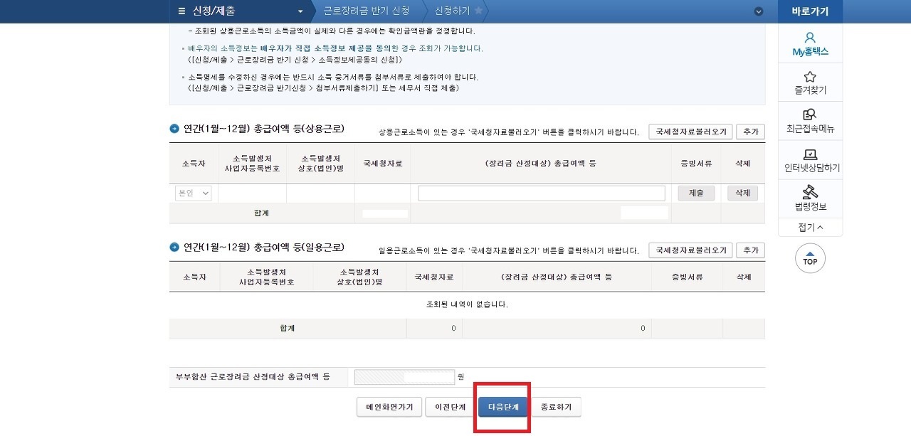 만약 신청 후 근로장려금 대상자가 아니라고해도 불이익은 없으니 근로장려금 정기신청을 눌러 대상자가 아니라는 창이 뜨지 않는다면 계속해서 신청하시면됩니다.