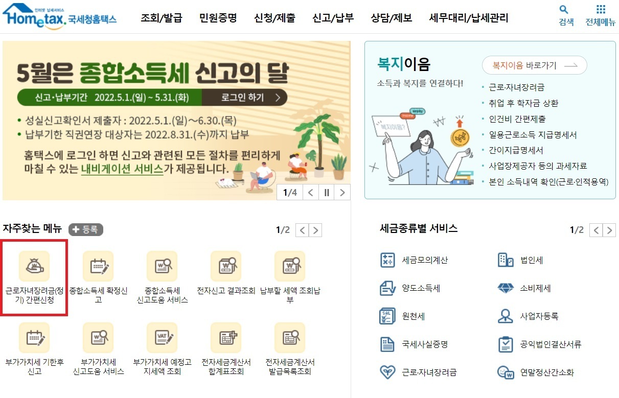 우선 국세청 홈택스에 접속해주세요. 홈택스 접속 후 근로자녀장려금(정기) 간편신청을 눌러주세요.