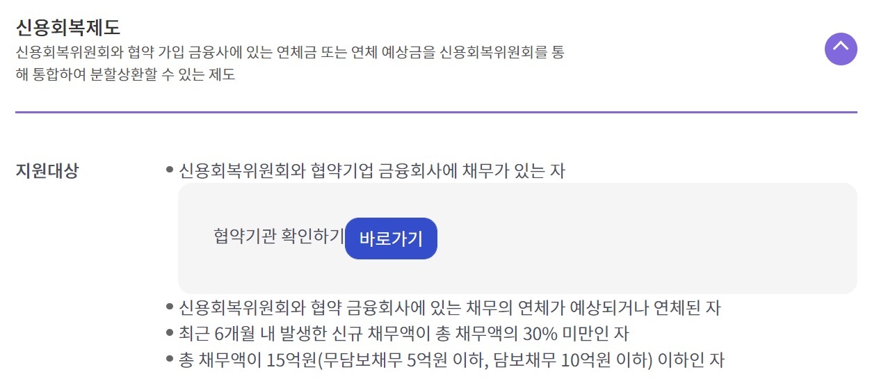 서민금융 통합지원센터 신용회복제도는 신용회복위원회와 협약 가입 금융사에 있는 연체금 또는 연체 예상금을 신용회복위윈회를 통해 통합하여 분할상환할 수 있는 제도입니다. 지원대상은 신용회복위원회와 협약기업 금융회사에 채무가 있는분입니다.