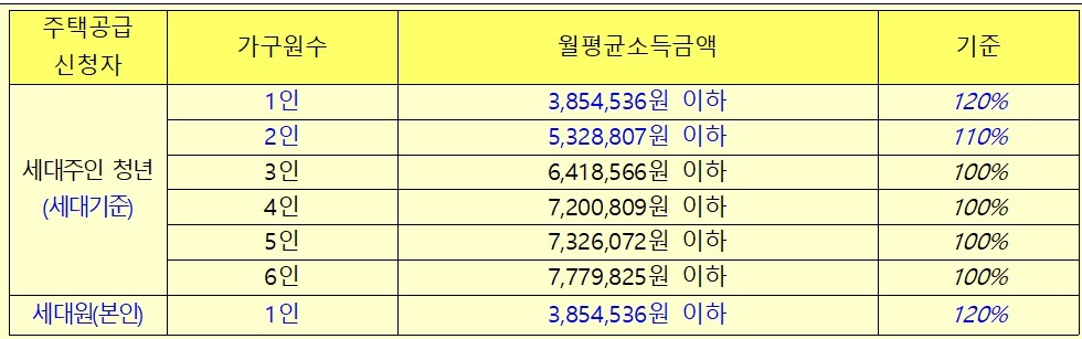 4. 해당세대의 월평균 소득이 전년도 도시근로자 가구원수별 가구당 월평균소득의 100% 이하(단, 가구원 수가 2명인 경우 110%)