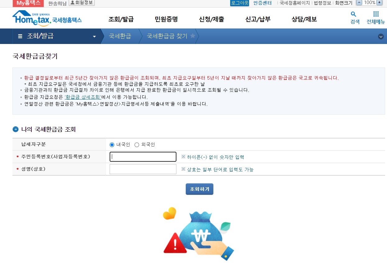 여기서 조회되는 환급금은 환급 결정일로부터 최근 5년간 찾아가지 않은 환급금이 조회되며, 최초 지급요구일부터 5년이 지날 때까지 찾아가지 않은 환급금은 국고로 귀속됩니다.