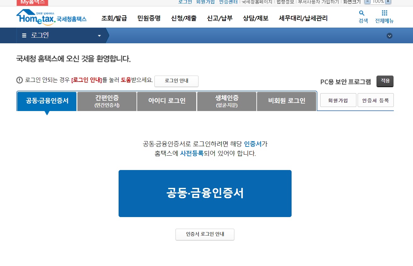 제일 먼저 국세청 홈택스 홈페이지에 접속하여 로그인해주시길 바랍니다.