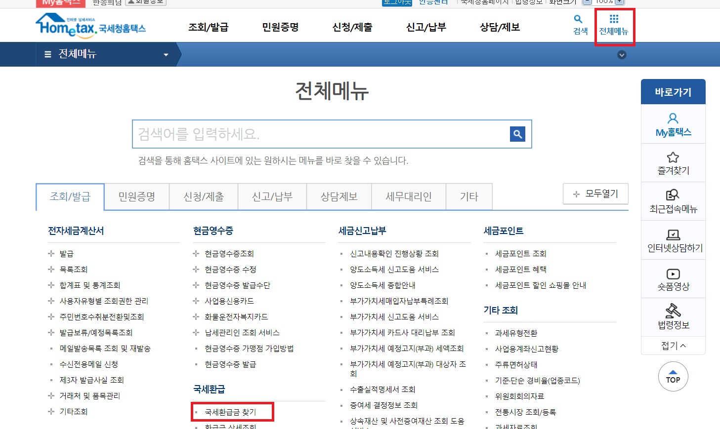 로그인 후 국세청 홈택스 메인페이지에서 전체메뉴 > 국세환급금 찾기 메뉴에 접속해주세요.