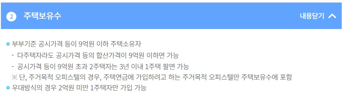 - 다주택자라도 합산가격이 공시가격 등이 9억원 이하면 가능