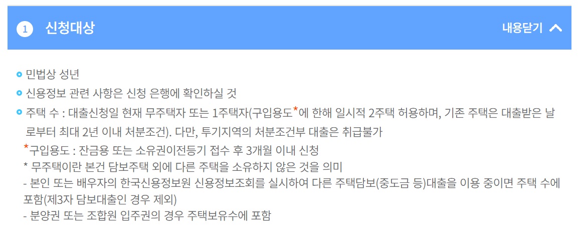 - 1주택인 경우 배우자 합산 연소득이 1억원 이하이고, 보유주택의 가격이 9억원을 초과하지 않아야함