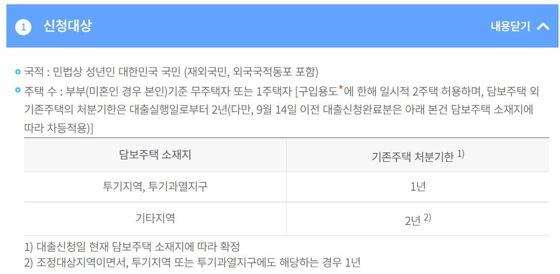 - 담보주택소재지에 따라 최대 2년 이내 기존 주택 처분, 투기지역