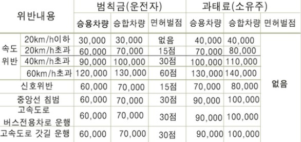 위의 기준이 일반적이며 스쿨존과 같은 보호구역에서 과속을 했거나 신호위반을 했을 경우 신호위반 과태료 2배 더 많이 부과 됩니다.