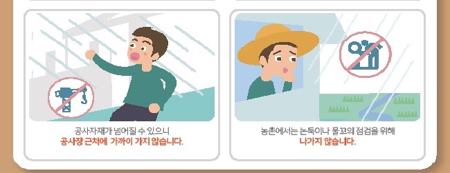 특히 침수지역, 산간 및 계곡 등 위험지역에 있거나 대피 권고를 받았을 경우에는 즉시 안전한 지역으로 대피해야합니다. 또 주변에 연세가 많거나 홀로 계신 어르신, 어린이, 장애인 등 대피에 어려움이 있는 분들은 안전하게 대피할 수 있도록 도울 수 있도록 합니다.